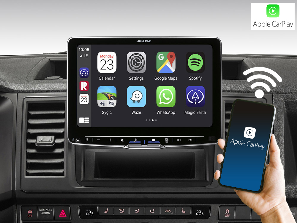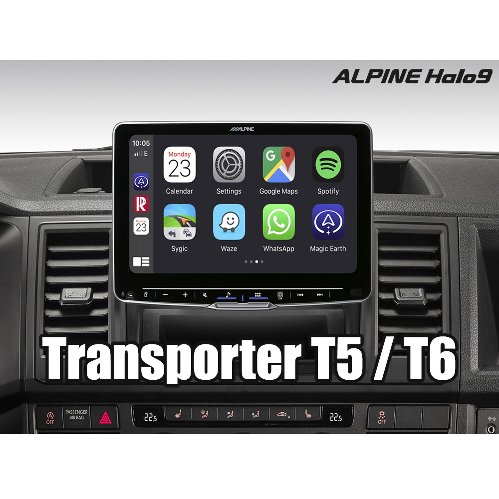 Alpine iLX-F905D-VWT6 on suurella 9″ WXGA-kosketusnäytöllä oleva soitin, joka on tehty Transporter T5 Facelift (2009 – 2015) ja Transporter T6 (2015 – 2019) -malleihin.