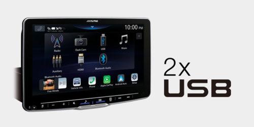 Alpine Halo9 ei sisällä CD-/DVD-koneistoa, mutta kahden USB-liitännän ansiosta saat esimerkiksi toisen liittimen kautta ladattua puhelintasi ja toisessa liittimessä voi olla USB-tikku tai kiintolevy, jolta toistat musiikki ja videotiedostoja.