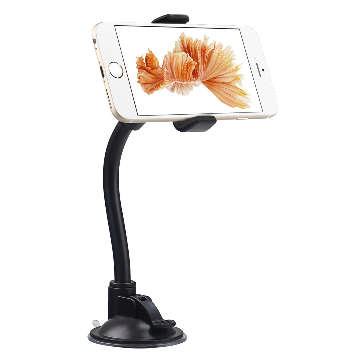 Aseta älypuhelin tai navigaattori tukevasti auton tuulilasiin tällä yleismallisella autotelineellä. Kiinnikkeessä on 21 cm pitkä joutsenkaula ja 360° kääntyvyys, joten saat laitteen helposti haluamaasi asentoon ja paikkaan. Teline on helppo irroittaa ja asentaa paikoilleen. Imukupin varressa olevalla kiristyspainikkeella saa telineen tiukasti kiinni tuulilasiin. Lisäksi joutsenkaula on jämäkkä eikä se taivu itsestään kovassakaan vauhdissa. Puhelimen saa nopeasti telineeseen tullessaan autoon ja puhelimen saa nopeasti napattua matkaan lähtiessään.