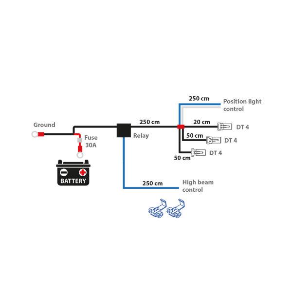 4-nap. DT Deutsch kytkentäsarja kolmelle parkilliselle lisävalolle, 4mm² syöttöjohdot, 4-nap. 12V 40A rele, roiskevesitiivis sulakerasia + sulake 30A