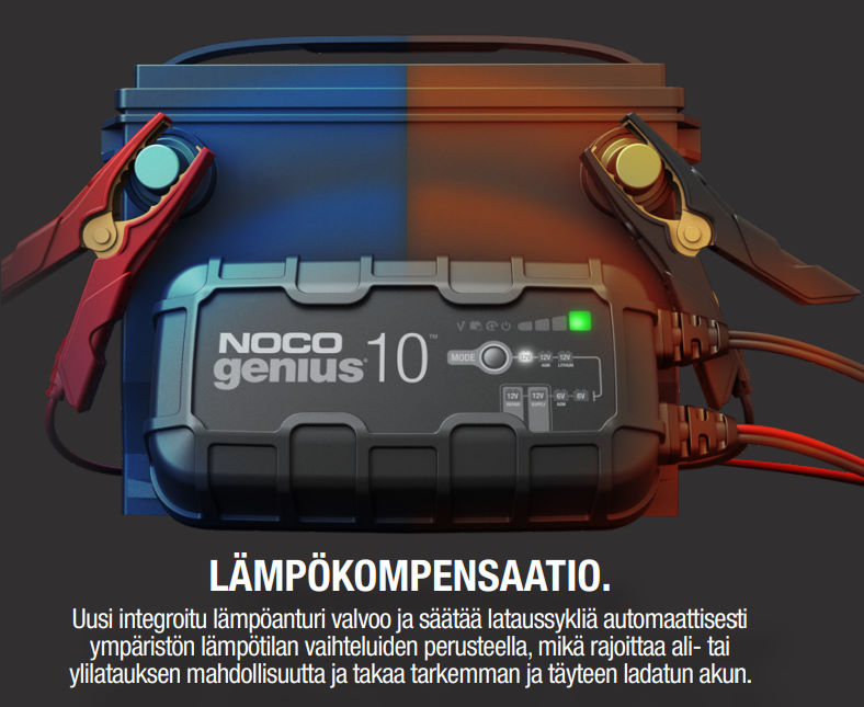 NOCO Genius 10A akkulaturi on täysin automaattinen ja huoleton laturi ympärivuotiseen käyttöön.
