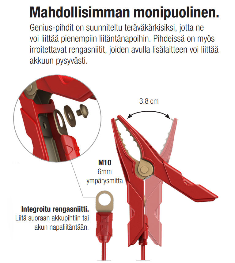 Suunniteltu ajoneuvojen ja veneiden 6- ja 12-volttisille lyijyhappoakuille sekä syvätyhjennysakuille, mukaanlukien neste-, geeli-, AGM- ja litiumioniakut sekä huoltovapaat akut.