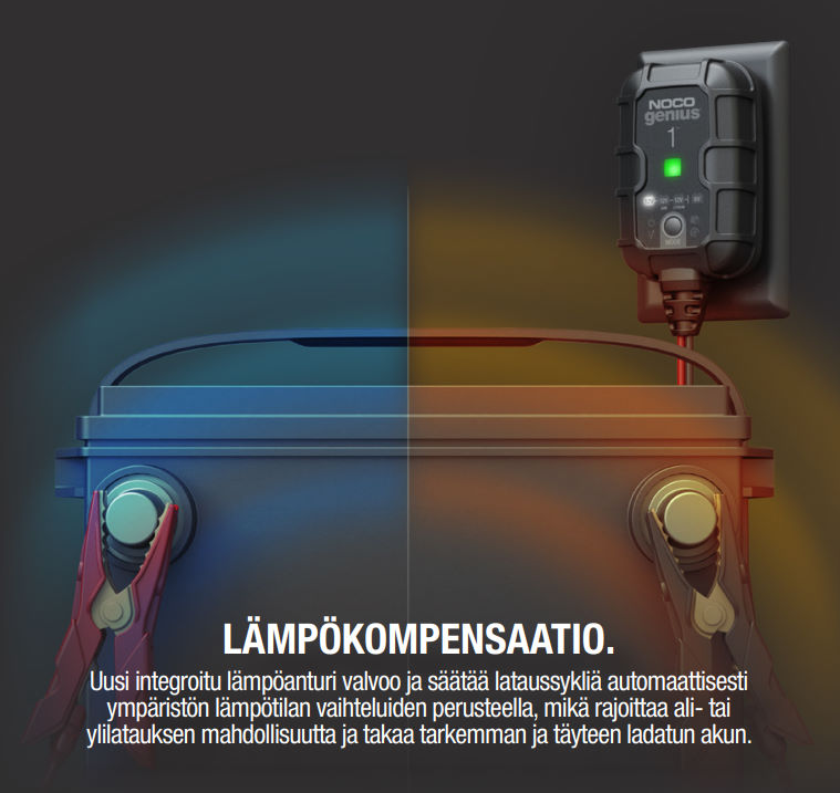 NOCO Genius 1A akkulaturi on täysin automaattinen ja huoleton laturi ympärivuotiseen käyttöön.