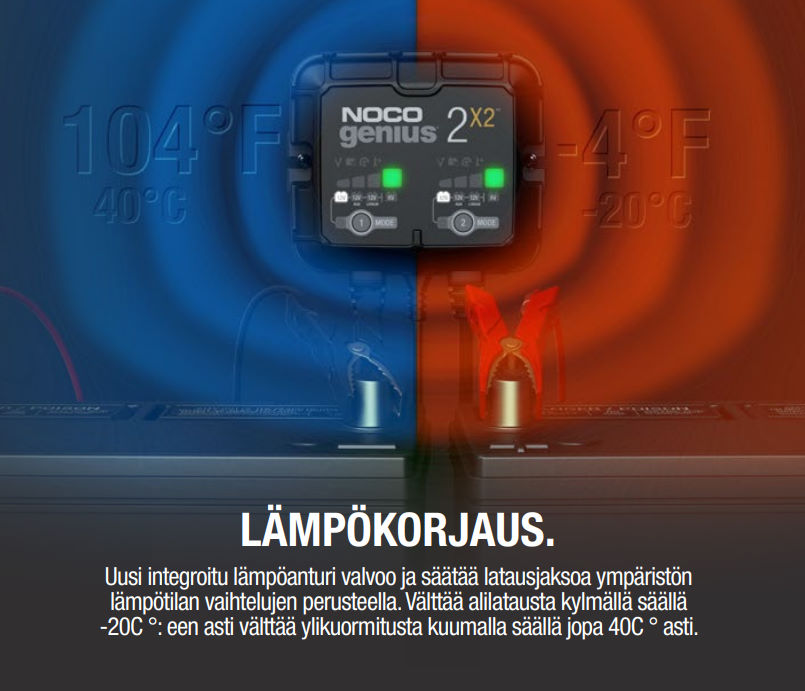 NOCO Genius 4 X 2A akkulaturi on täysin automaattinen ja huoleton laturi ympärivuotiseen käyttöön.