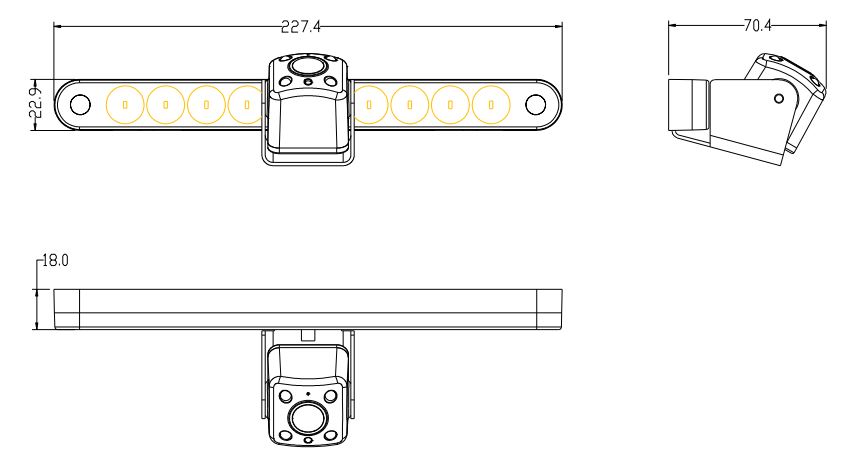 Valo on kooltaan 227.4mm x 22.9mm x 70.4 mm, pyöreillä reunoilla.