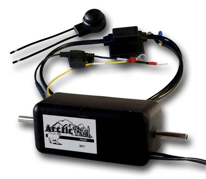 Jännite- ja termostaattiohjattu polttoaineen esilämmitin 24V järjestelmiin.
