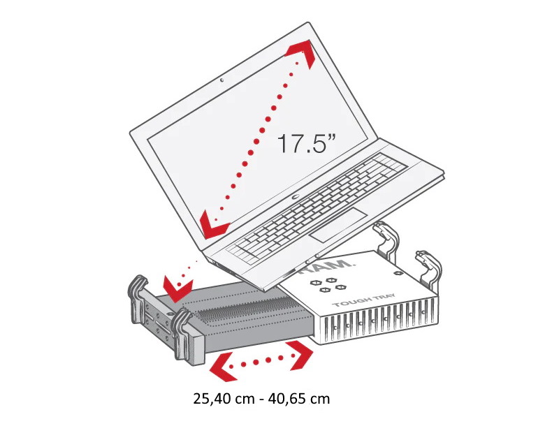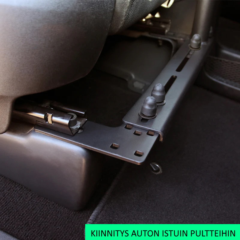 RAM Mountsin tietokoneteline autoon on ratkaisu kun haet säädettävää, mutta pitävää kiinnitysratkaisua kannettavan tietokoneen kiinnittämiseen.