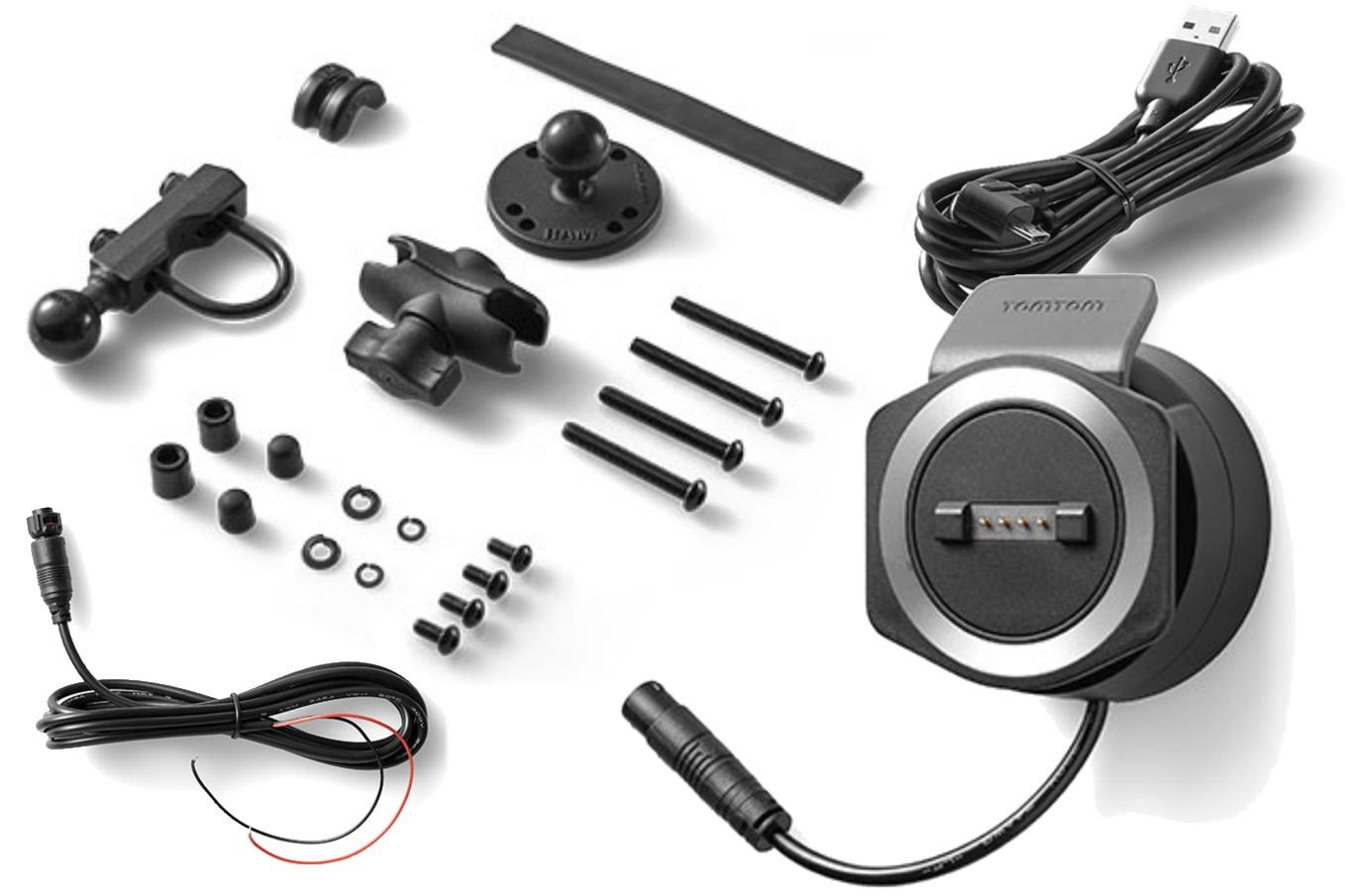 TomTom Rider 550 Premium Pack sisältää navigaattorin ja kiinnitystarvikkeiden lisäksi autotelineen, RAM-lukitusjärjestelmän + avaimet ja suojalaukun.