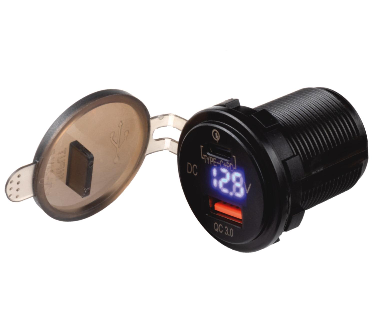 Vedenpitävä USB-pistorasia venekäyttöön tai esim ATV-ajoneuvoihin. Upotettavassa pistorasiassa 2 USB-lähtöä(USB-A ja USB-C) sekä akun jännitteen tilan näyttö.